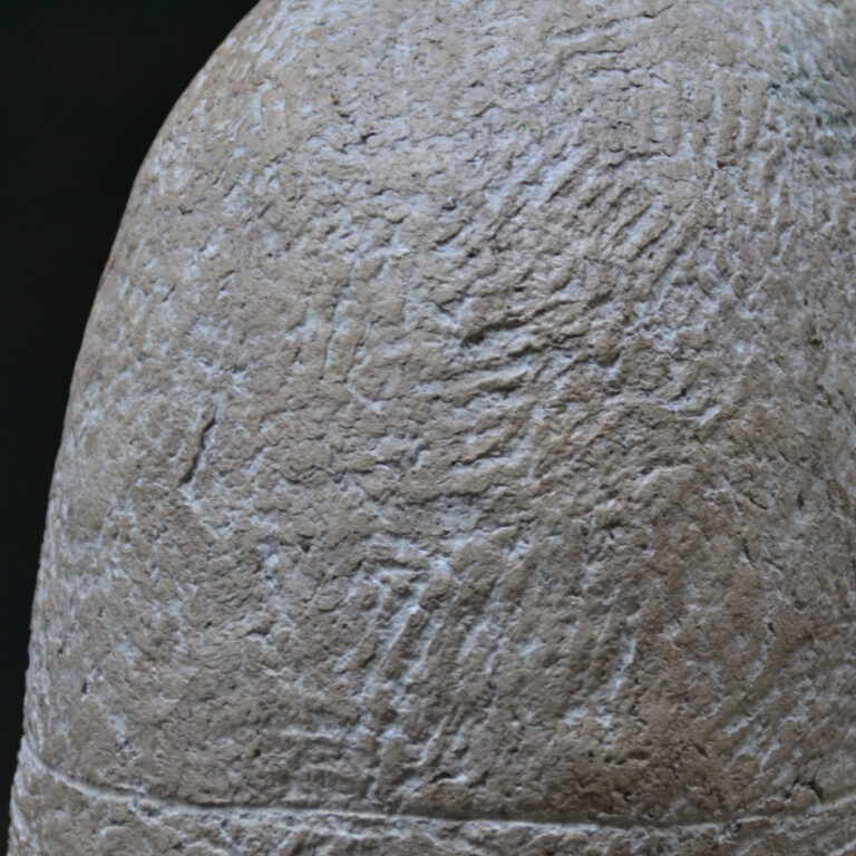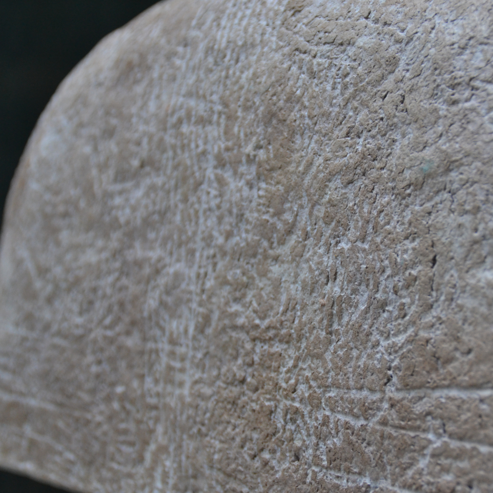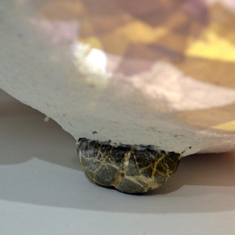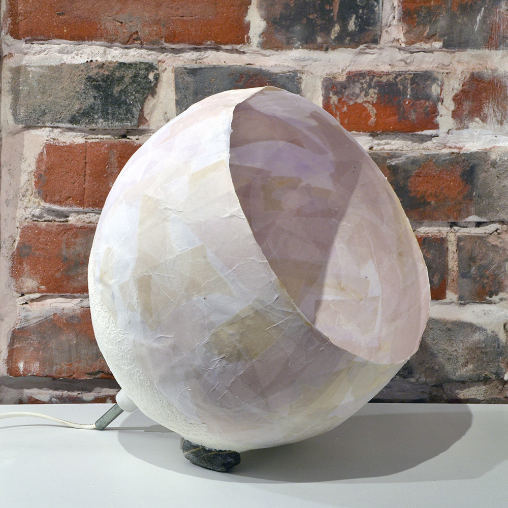 The objects are created using mixed techniques: papier-mâché, papier-collé, semi-opaque paper, and the insertion of natural elements such as plants, stones, and natural pigments.